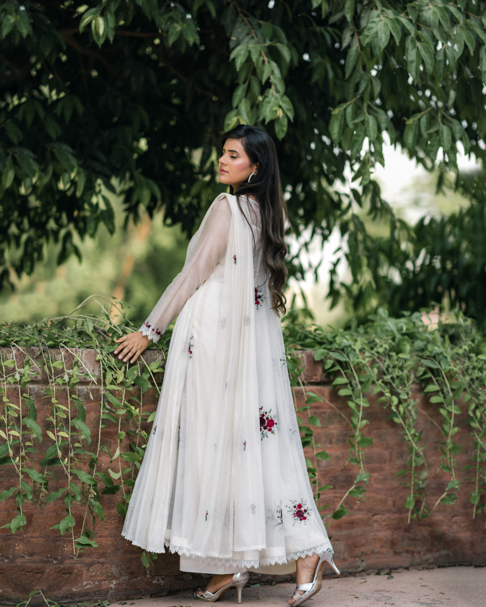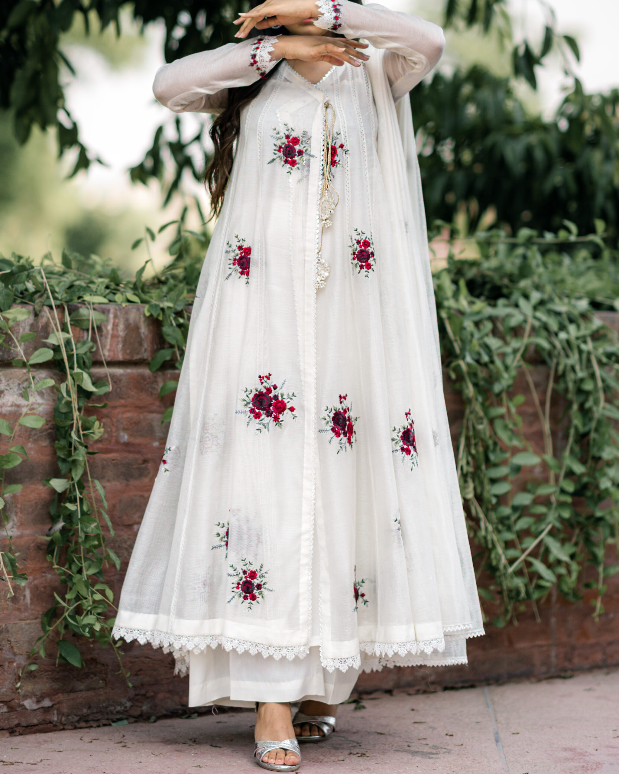 A silk net angrakha with rose bunches overall finished with intricate laces paired with silk net dupatta butties with lace.